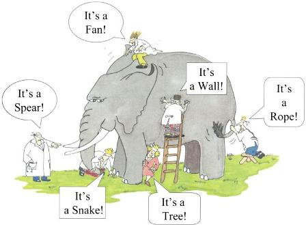 「群盲象を評す」という言葉をご存じでしょうか。物事の一側面だけを見てすべてを理解した気になってしまうことのたとえです。下の図のように、一部分しか把握できていなければ、触っているものの正体は象でも、それを縄だと言ったり蛇だと言ったりしてしまいます。