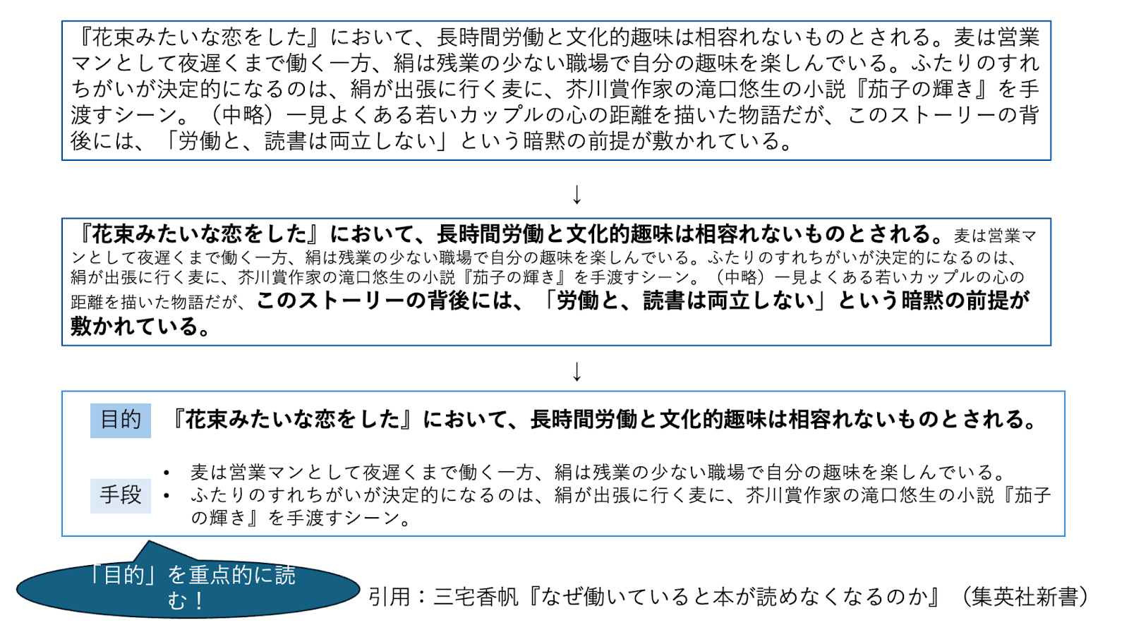 目的と手段では、目的の方が重要ですよね。このように、文章ごとの役割を意識し、優先順位をつけられるようになると、文章を速く読めるようになります。