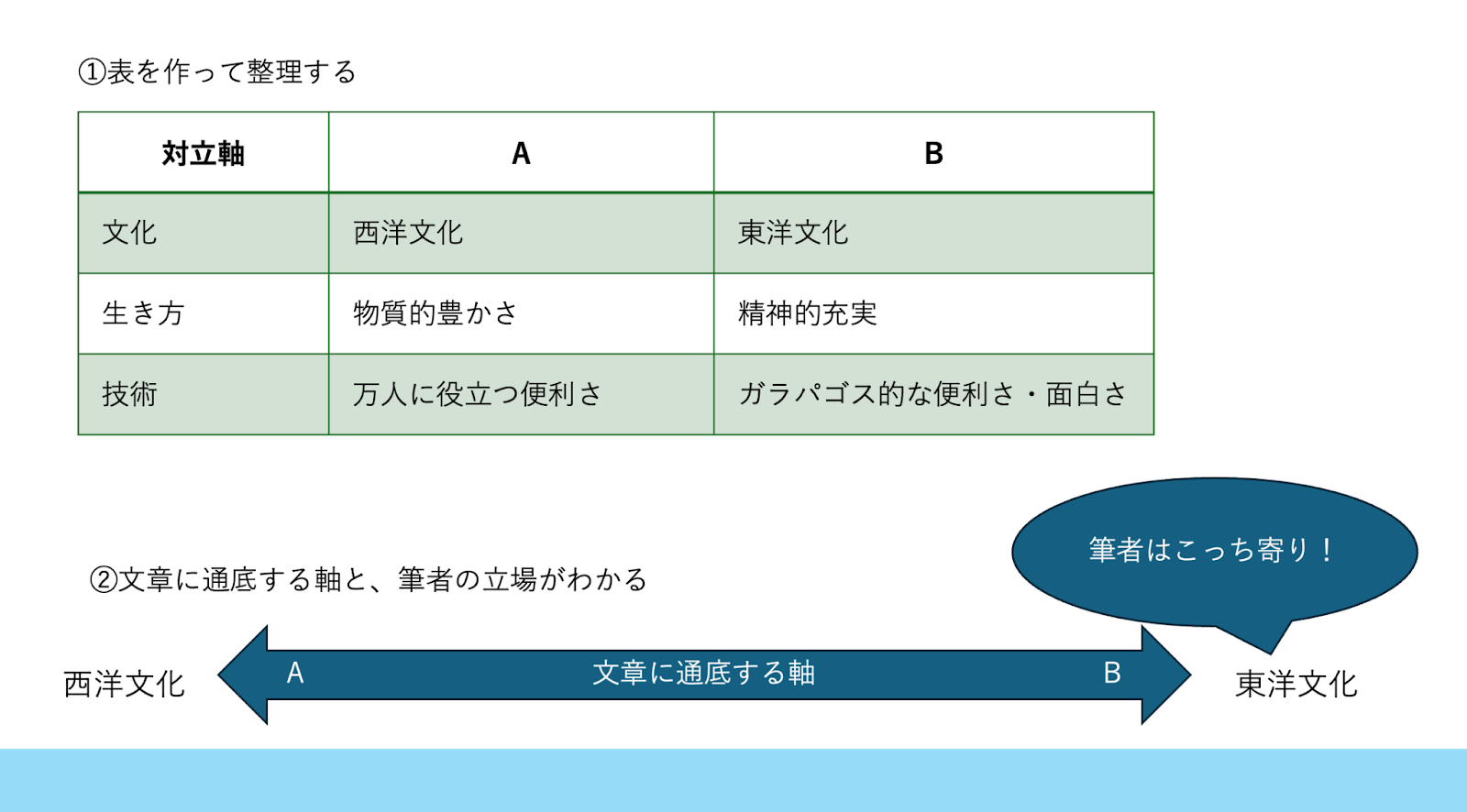 - 二項対立(対比)を探す。どんな対立軸が背後にあるのかがわかれば、筆者の立場がより明確になります。