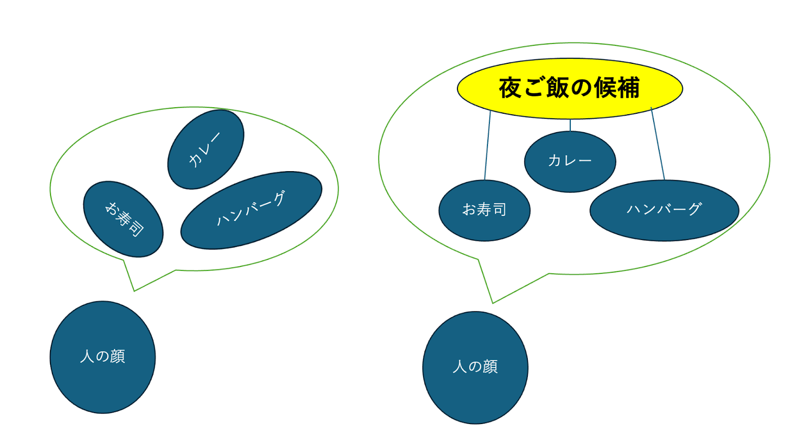もう一つの例として、ある雑談のシーンを想像してみてください。あなたが友人に「カレーもいいし、お寿司もいいな…」と言われたとしましょう。一見、ただ食べ物を羅列しただけに聞こえる発言ですが、会話のテーマが〈晩ご飯として食べたいもの〉であることだとわかっていれば、その羅列は「晩御飯の選択肢を挙げている」発言だと理解できます。つまり、テーマを先に意識できれば、細部の言葉がどのような意図を持つか、一気に見えてくるのです。