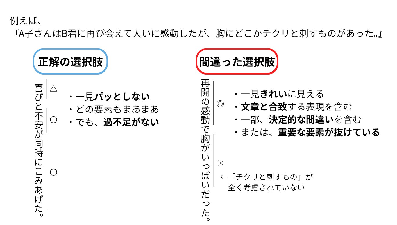 一方で、正解の選択肢は地味で、一見すると不親切な表現に見えるため、敬遠されがちなのです。