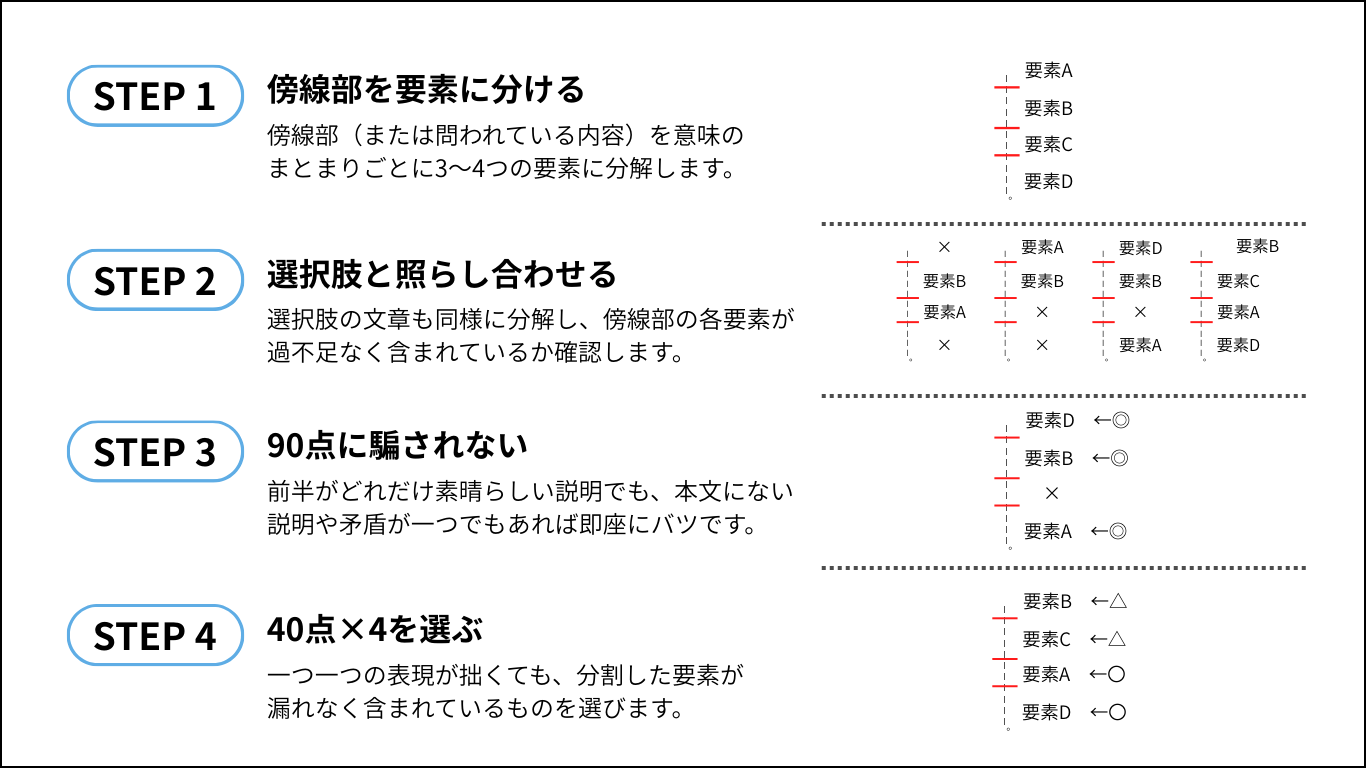 選択肢の文章も同様に分解し、傍線部の各要素が過不足なく入っているかを確認します。